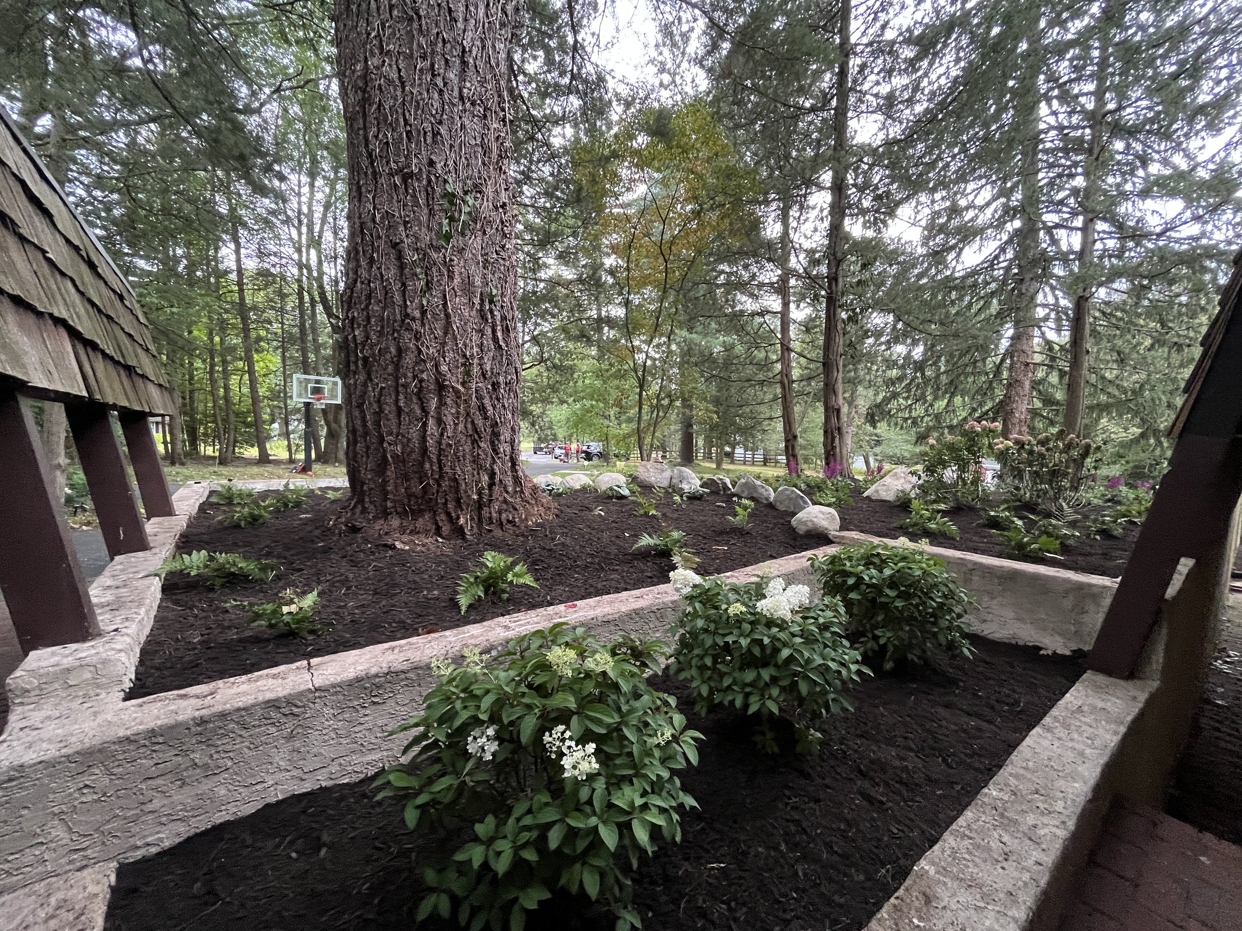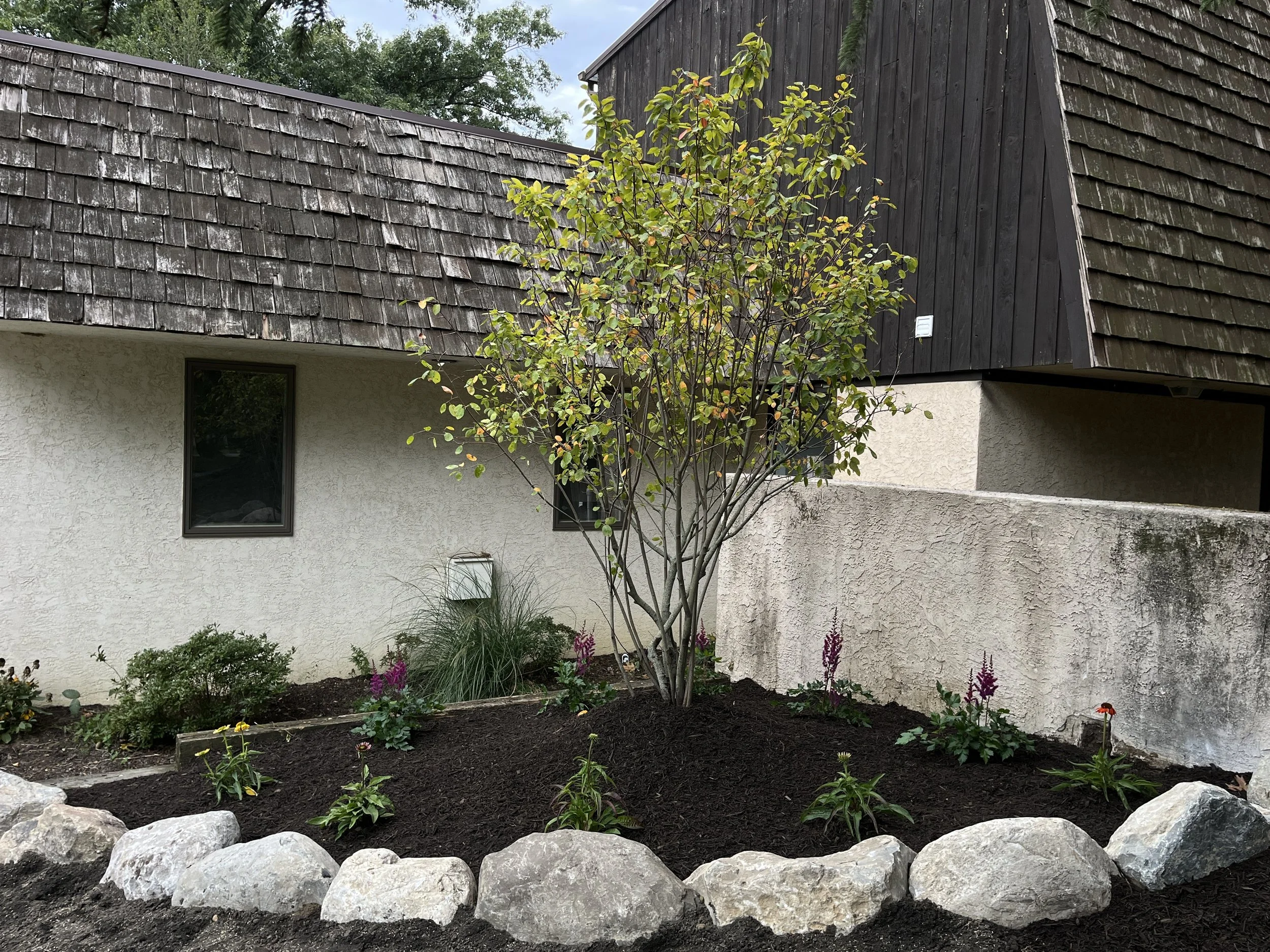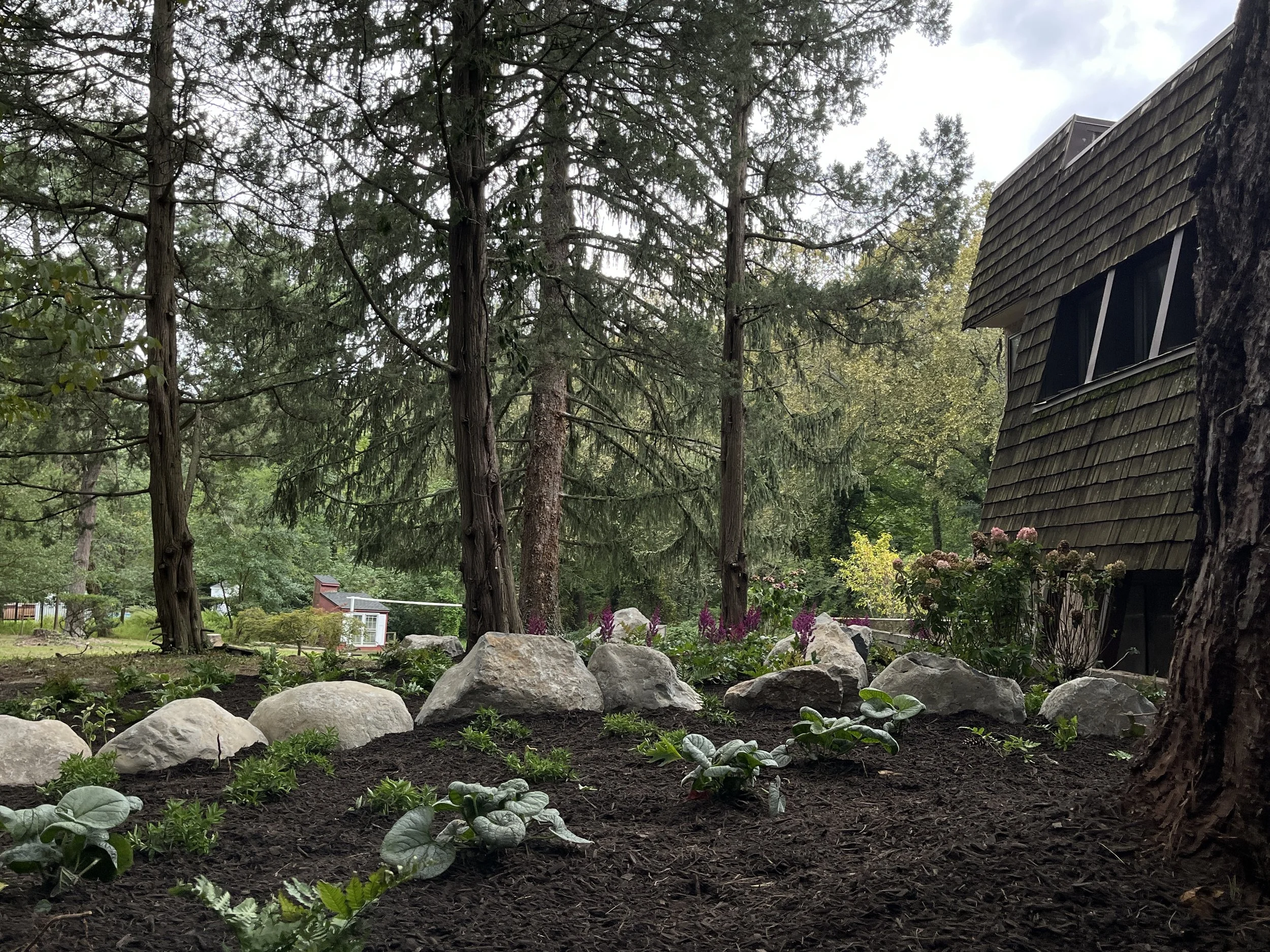 We began the restoration process by eradicating all invasive species and weeds through mechanical removal, including the roots. Next, we graded the area and applied a selective herbicide to prevent weeds from returning. The boulders brightened this shady garden and added texture and a new dimension to the space. The final step was placing a carefully selected mix of native ferns, Astilbe, Phlox, Salomon’s Seal, and Brunnera, all of which tolerate part to full shade conditions. The perennials were arranged in flowing groups to restore the natural look of the forest and to complement the moss-covered boulders in perfect harmony.