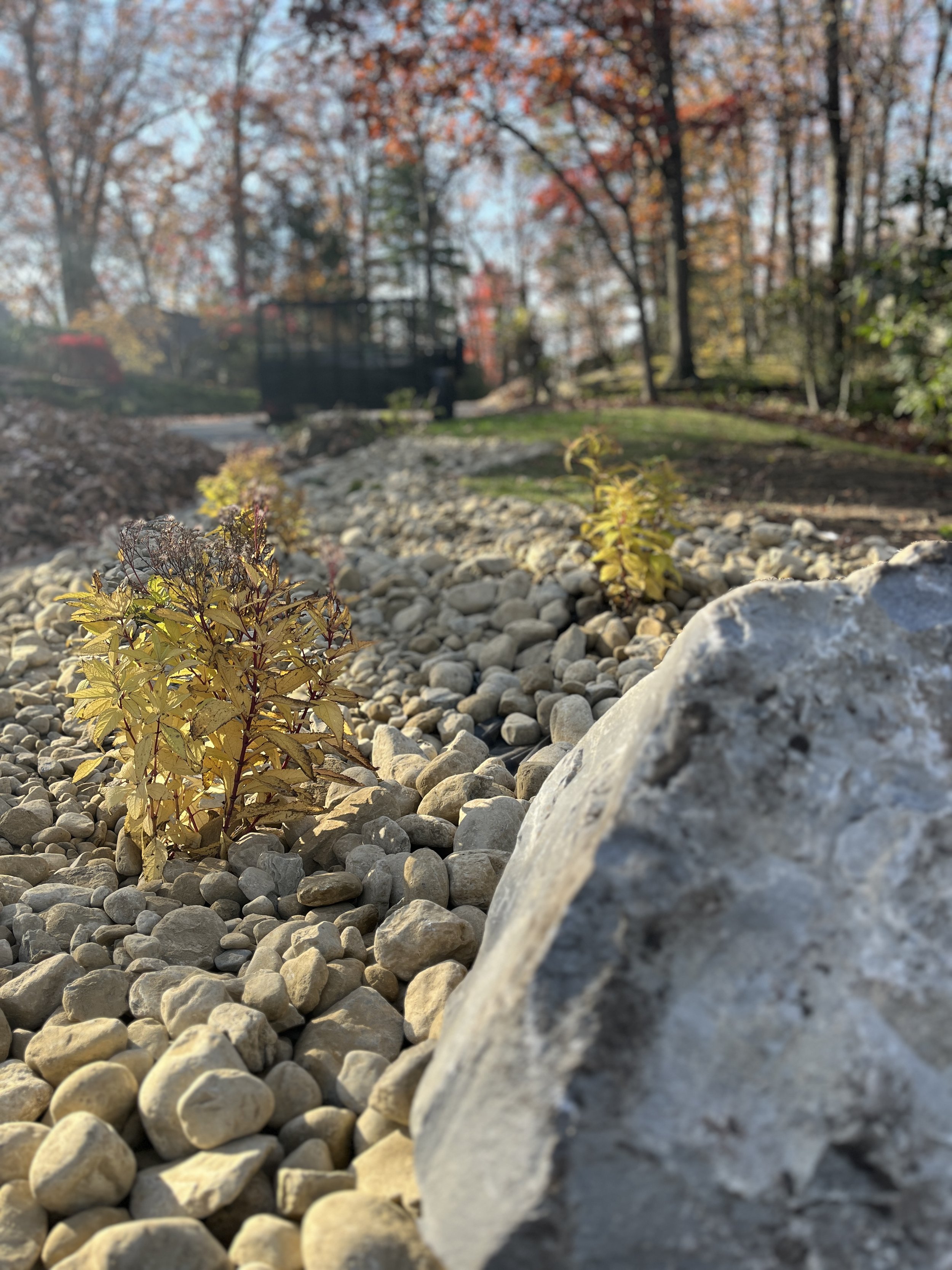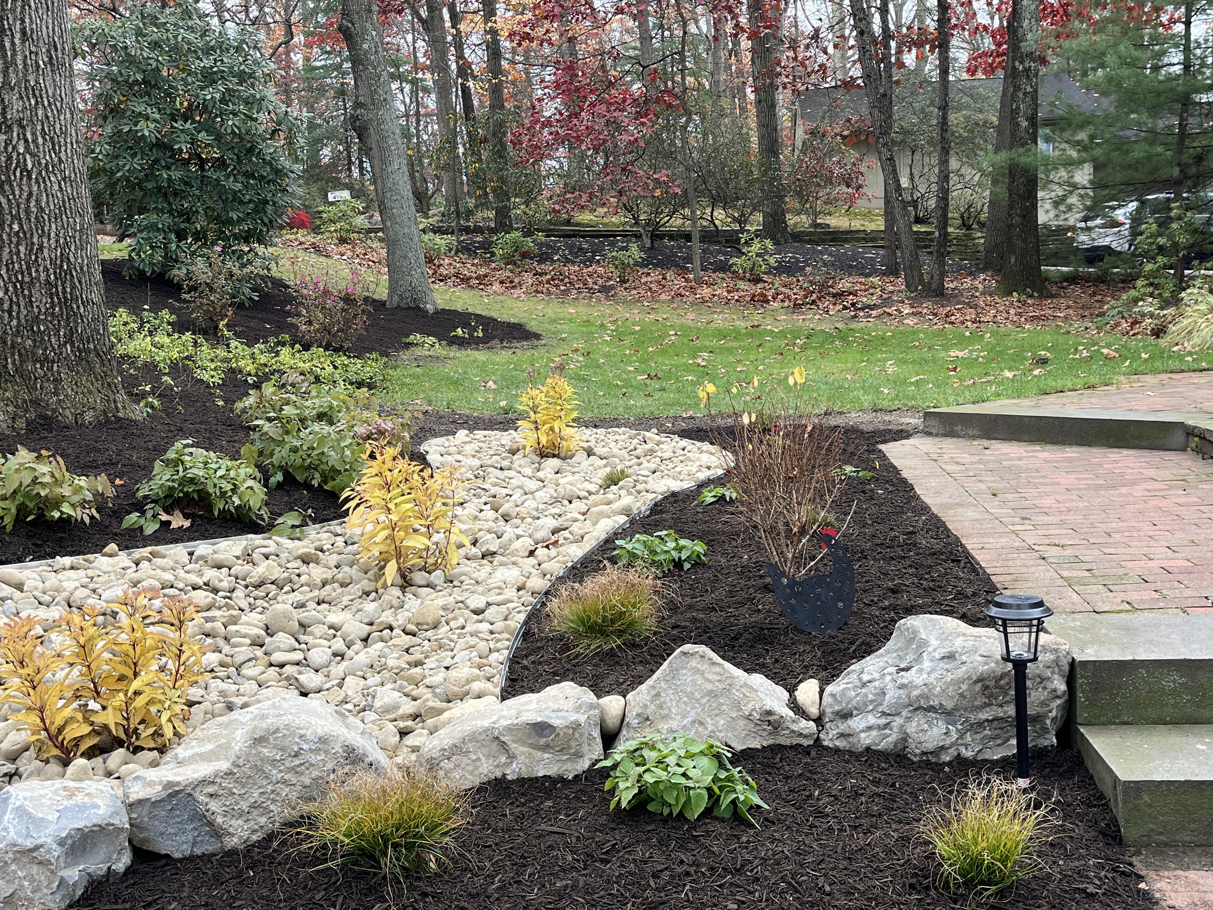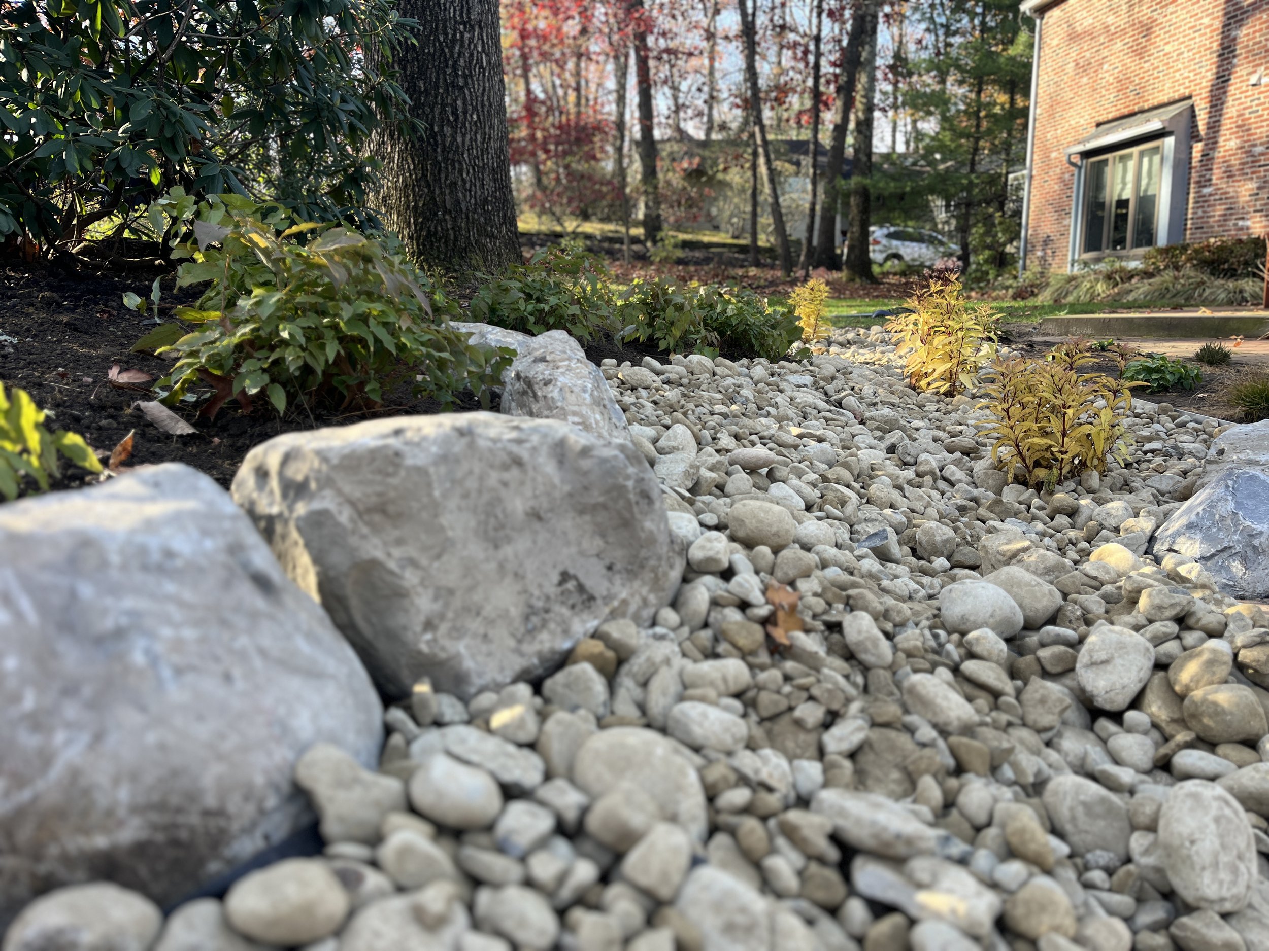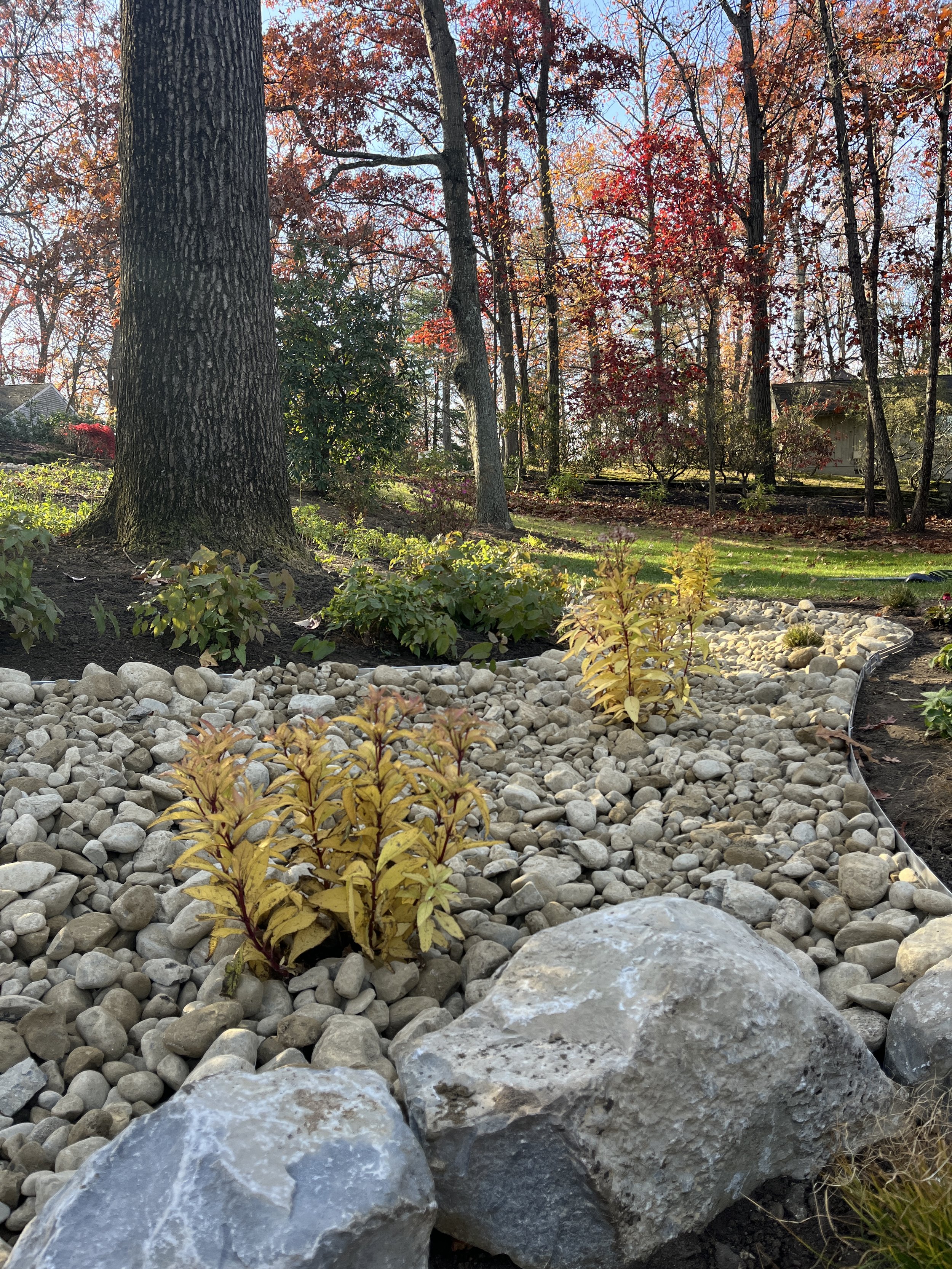 Where there’s problem with drainage and erosion, we can always find a practical, yet beautiful solution. Creating a rain garden that captures the storm water and utilizes it on-site is one of the best decisions. Introducing native plants that tolerate those conditions, like Joe-Pye Weed, Bee Balm, Cardinal Flower, Purple Coneflower and native grasses like Sedges, is even a better idea. Plus a catch basin to collect the excess of runoff and to direct it off-site!