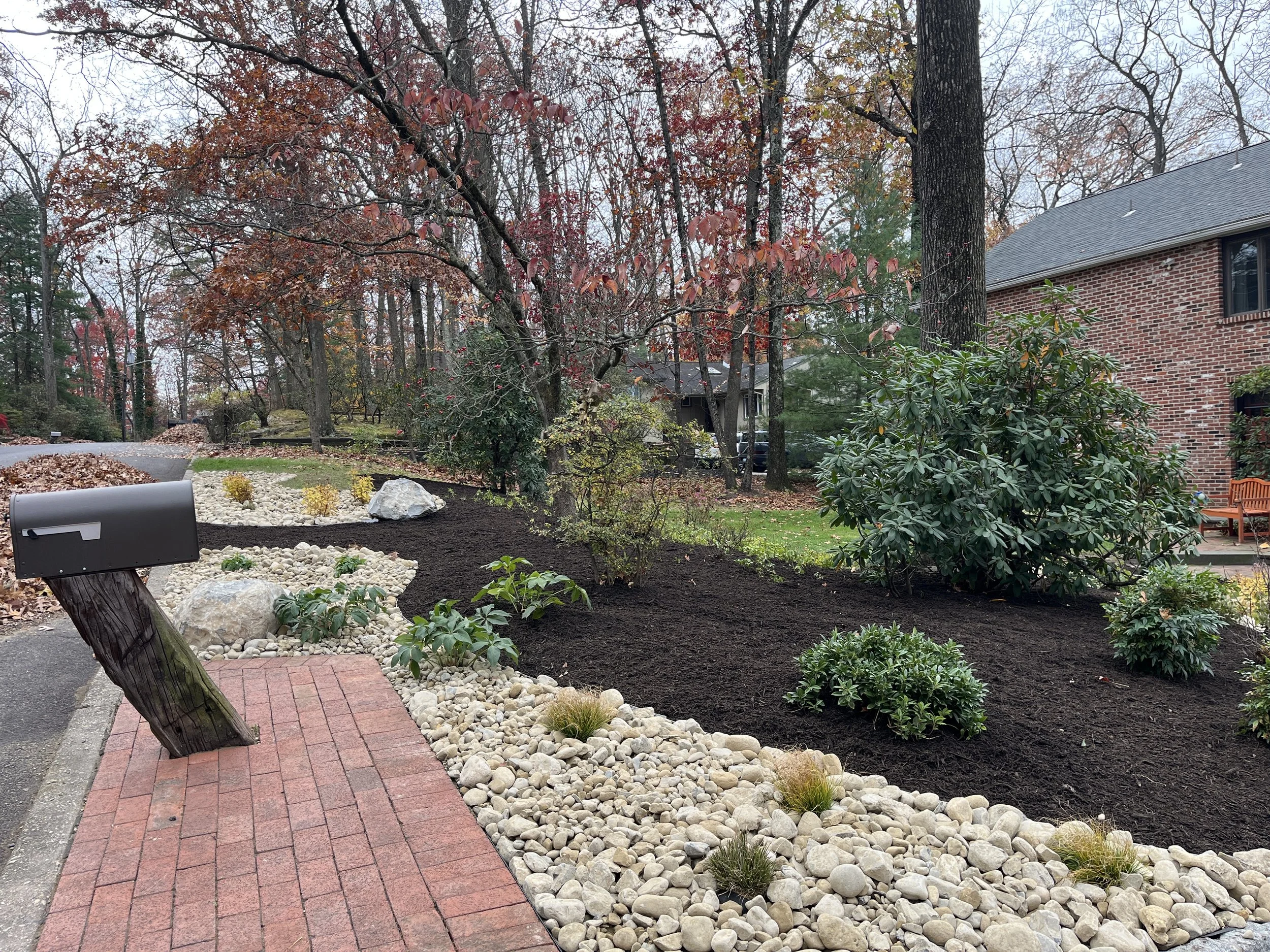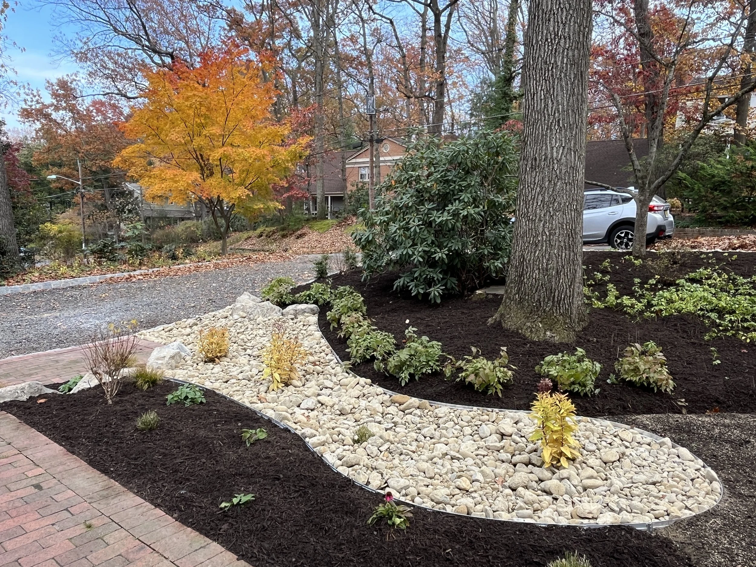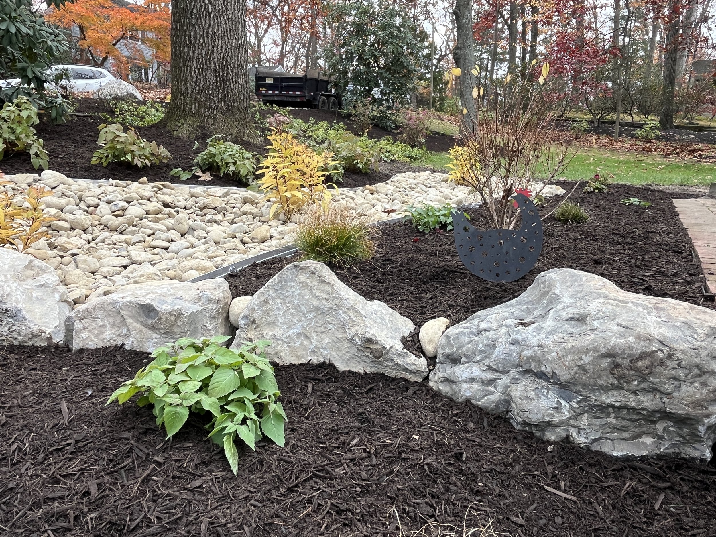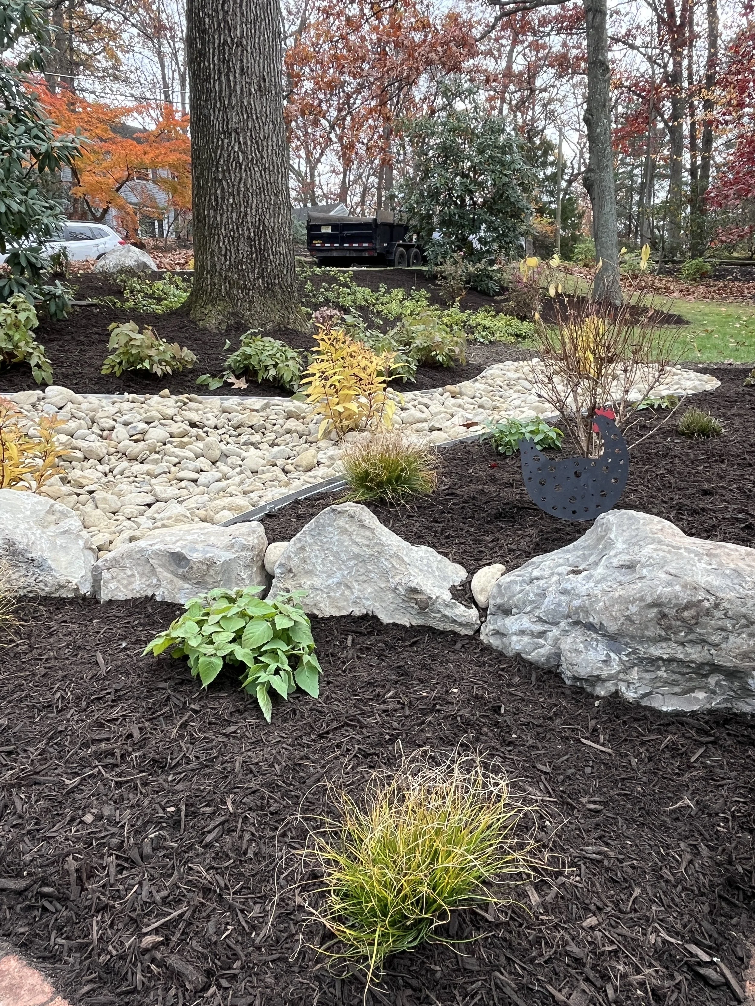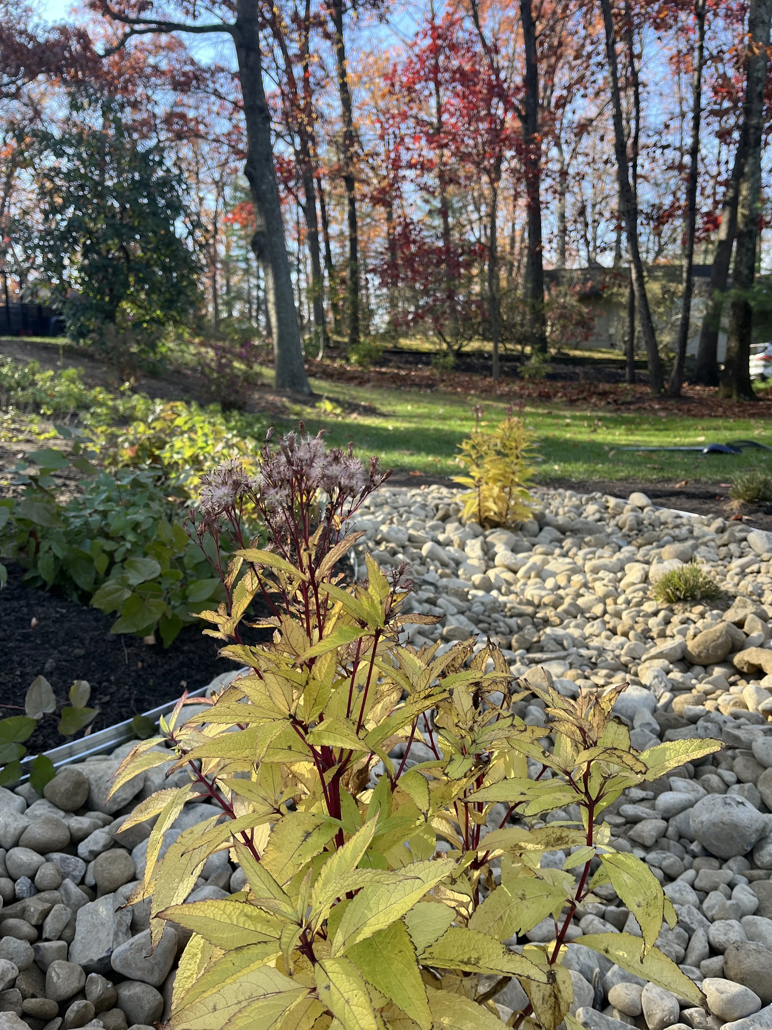 Where there’s problem with drainage and erosion, we can always find a practical, yet beautiful solution. Creating a rain garden that captures the storm water and utilizes it on-site is one of the best decisions. Introducing native plants that tolerate those conditions, like Joe-Pye Weed, Bee Balm, Cardinal Flower, Purple Coneflower and native grasses like Sedges, is even a better idea. Plus a catch basin to collect the excess of runoff and to direct it off-site!